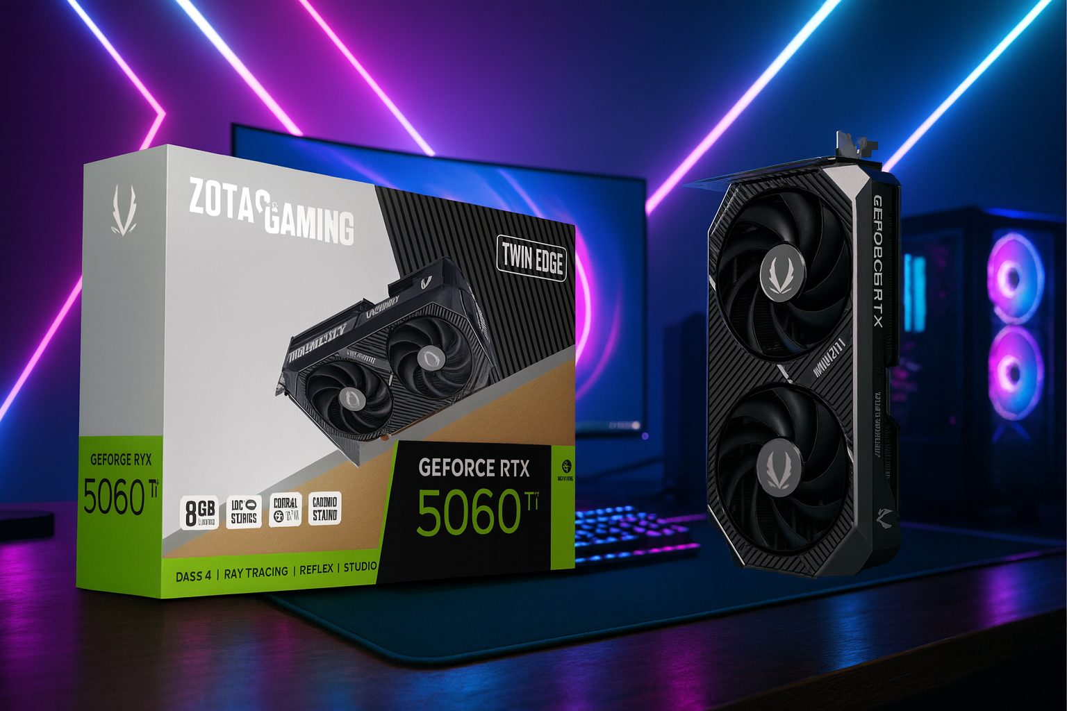 Carte Graphique Gaming Zotac - Chipset graphique : NVIDIA GeForce RTX 5060 Ti Twin Edge - Mémoire graphique : 8Go - Type de mémoire : GDDR7 - Fréquence boostée : 2572 MHz - Bloc d'alimentation recommandé : 600W - Interface: PCI Express 5.0 x8 - Noyaux Cuda: 4608 - Horloge mémoire: 28 Gbit/s - Bus Mémoire: 128 bits - Prise en charge des versions DirectX: 12 Ultime - Version Opengl: 4.6 - Consommation d'énergie: 180 Watts - Affichage: Affichage quadruple - Refroidissement: Tempête de glace 2.0 - Systèmes d'Exploitation pris en charge: Windows 11, Windows 10 64 bits (v1809 novembre 2018 ou version ultérieure) - Connecteurs: 1x HDMI, 3x DisplayPort 2.1b - Dimension: 220,5 x 120,25 x 41,6 mm - Couleur : Noir - Garantie : 1 an