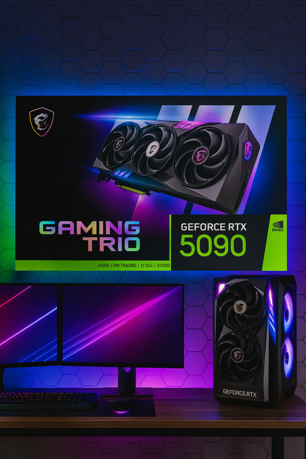 Carte Graphique Gaming MSI Trio OC - Chipset graphique : NVIDIA GeForce RTX 5090 - Mémoire graphique : 32 Go - Type de mémoire : GDDR7 - Fréquence boostée : 2 482 MHz (Performances extrêmes : 2 497 MHz (MSI Center)) - Bloc d'alimentation recommandé : 1000 W - Noyaux Cuda : 21760 unités - Vitesse memoire: 28 Gbit/s - Résolution numérique maximale: 7680 x 4320 - Bus Mémoire: 512 bits - Prise en charge des versions DIRECTX: 12 Ultime - Consommation d'énergie: 575 Watts - Version Opengl: 4.6 - Connecteurs D'alimentation: 16 broches x 1 - Affichages maximum: 4 - Connecteurs: 1x HDMI 2.1b, 3x DisplayPort (v2.1b) - TECHNOLOGIE G- SYNC - Dimensions: 359 x 149 x 70 mm - Couleur : Noir - Garantie : 1 an