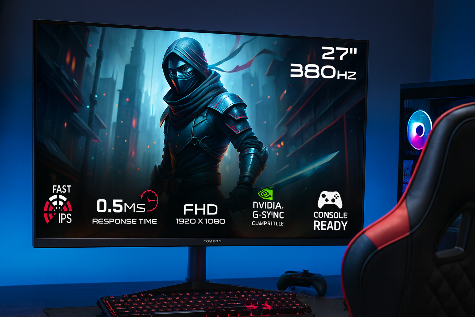 Ecran Gaming Gameon Midnight Pro Series - Taille de l'écran : 27" FHD, 380Hz - Résolution : 1920 x 1080 Pixels - Luminosité : 300cd/m² - Format de l'écran : 16:9 - Rapport de contraste : 1000:1 - Temps de réponse : 0.5 ms - Angle de vision large : 178°(H) / 178°(V) - Connecteurs : 2x Display port(1,4) - 2 x HDMI 2,1 - 1x3.5mm Headphone Jack (Output) - Dual haut parleur integré - Compatible HDR10 - Température de stockage: -20°C à 60°C - Montage VESA : 100 × 100 mm - Compatible Nvidia Gsync & AMD Freesync - RGB Back Panel Light - Ajustable stand, compatible PS5 - Xbox Series -Nintendo Switch - Poids : 4.26 kg - Couleur : Noir - Garantie : 2 ans