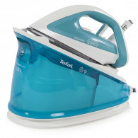 Fer à repasser générateur de vapeur Tefal - Puissance: 2000 Watts - Vapeur verticale: 100g/ min - Super vapeur: 240g/ min - Pression de vapeur: 4.5 bar - Temps de chauffage: 2 min - Capacité du réservoir d'eau: 1,5 L - Longueur du cordon d'alimentation: 1,7 m - Type de semelle: Durilium - Réglage manuel de la température - Système Anti-calcaire - Poids: 3,68 kg - Dimensions: 33,5 x 21,6 x 27 cm - Couleur: Turquoise - Garantie: 1 an