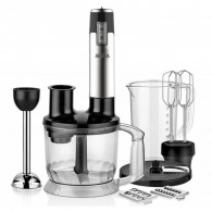 Set Multi-Mixeur - Puissance : 1000 W - Vitesse : Réglable - Godet Gradué (ml) : 800 - Bol du hachoir (ml) : 1500 - Système de sécurité - Fonction Turbo - Lame Mixeur En Acier Inoxydable - Attachement de Mixeur En Acier Inoxydable - Batteur en acier inoxydable - Lame Hachoir En Acier Inoxydable - Disque de déchiquetage et de découpage - Boucle de suspension - Couleur : Inox - Garantie: 1 an
